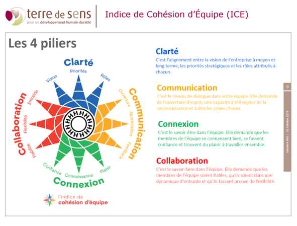 C’est précisément ce que permet l’indice de cohésion d’équipe. A savoir mesurer le bien-être ET la performance. L’Indice de Cohésion d’Équipe a été créé au Canada il y a deux ans par Gabriel Renaud, auteur, conférencier, fondateur de la société HUBU, expert en accompagnement de la performance collective, ancien sportif de haut niveau. Concrètement, ICE est un outil de diagnostic d’équipe qui permet de mesurer 4 piliers de la cohésion :